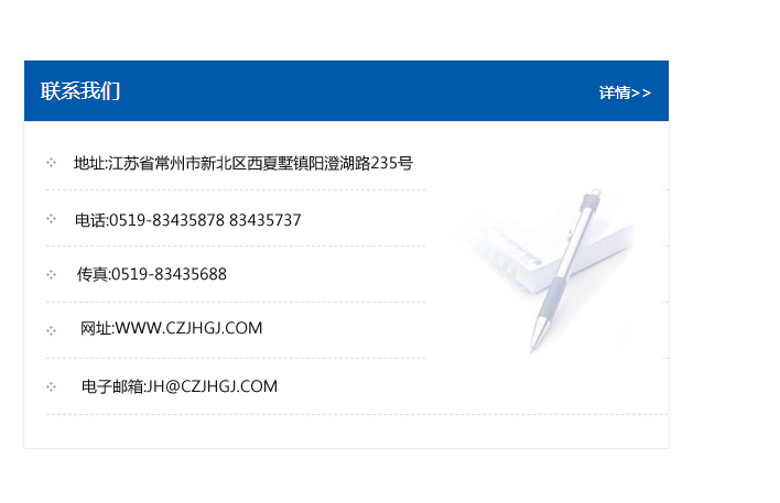 地址:常州市新北區友邦商務大廈1幢16、17層  電話:0519-85101652  傳真:0519-85112595  郵編:213022  網址:www_cz-jiayue_cn.tjzlynb.com  郵箱:xiajifengaa@163.com